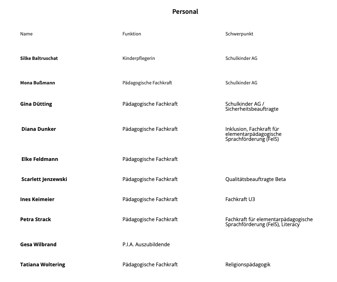| Silke Baltruschat | Kinderpflegerin | Schulkinder AG | ||